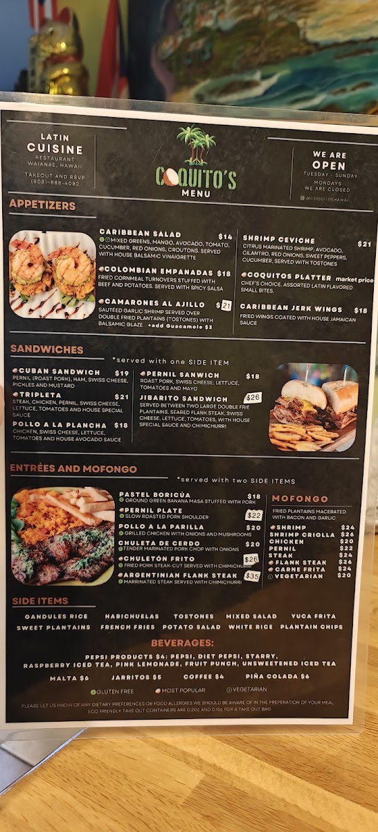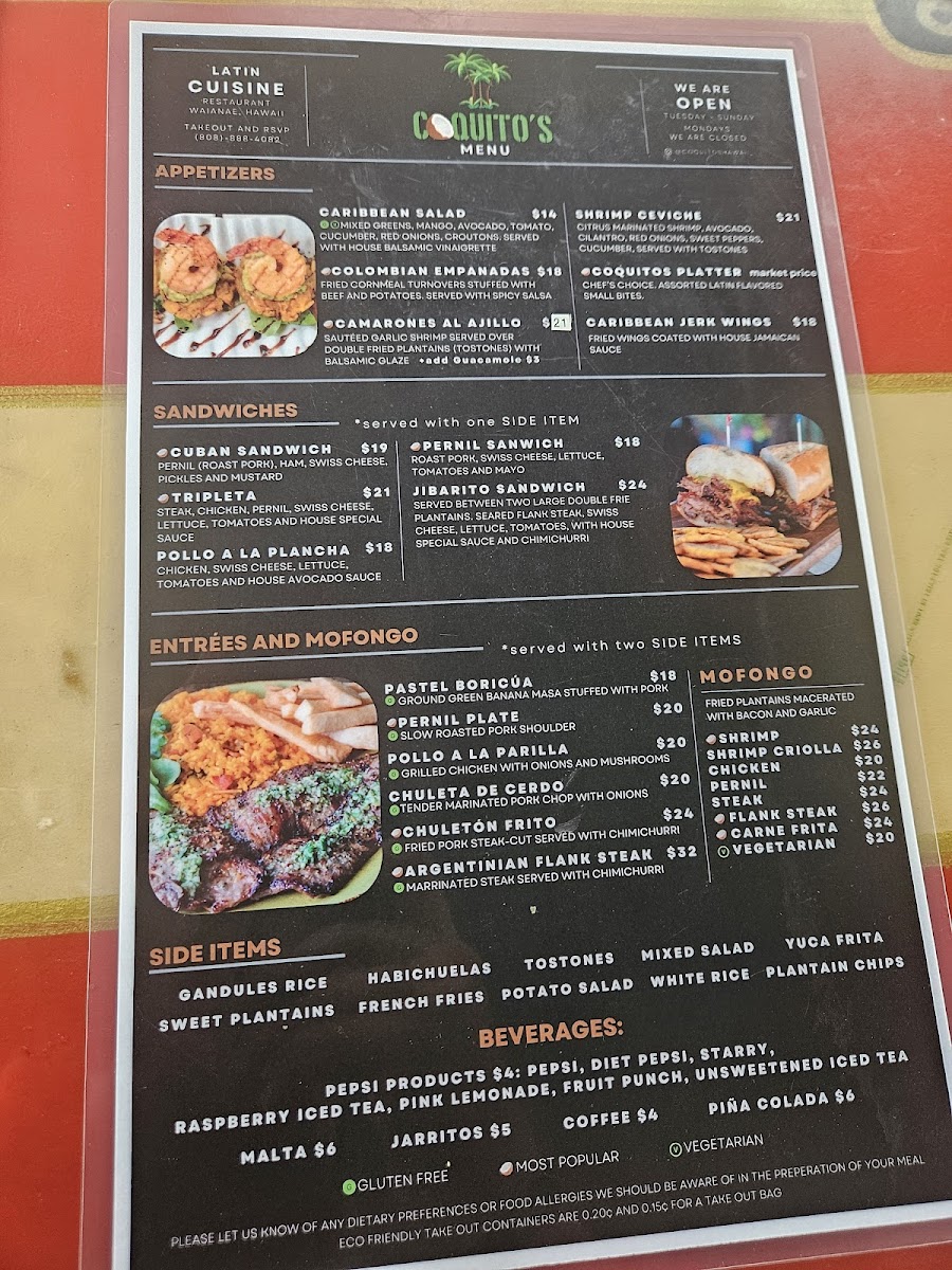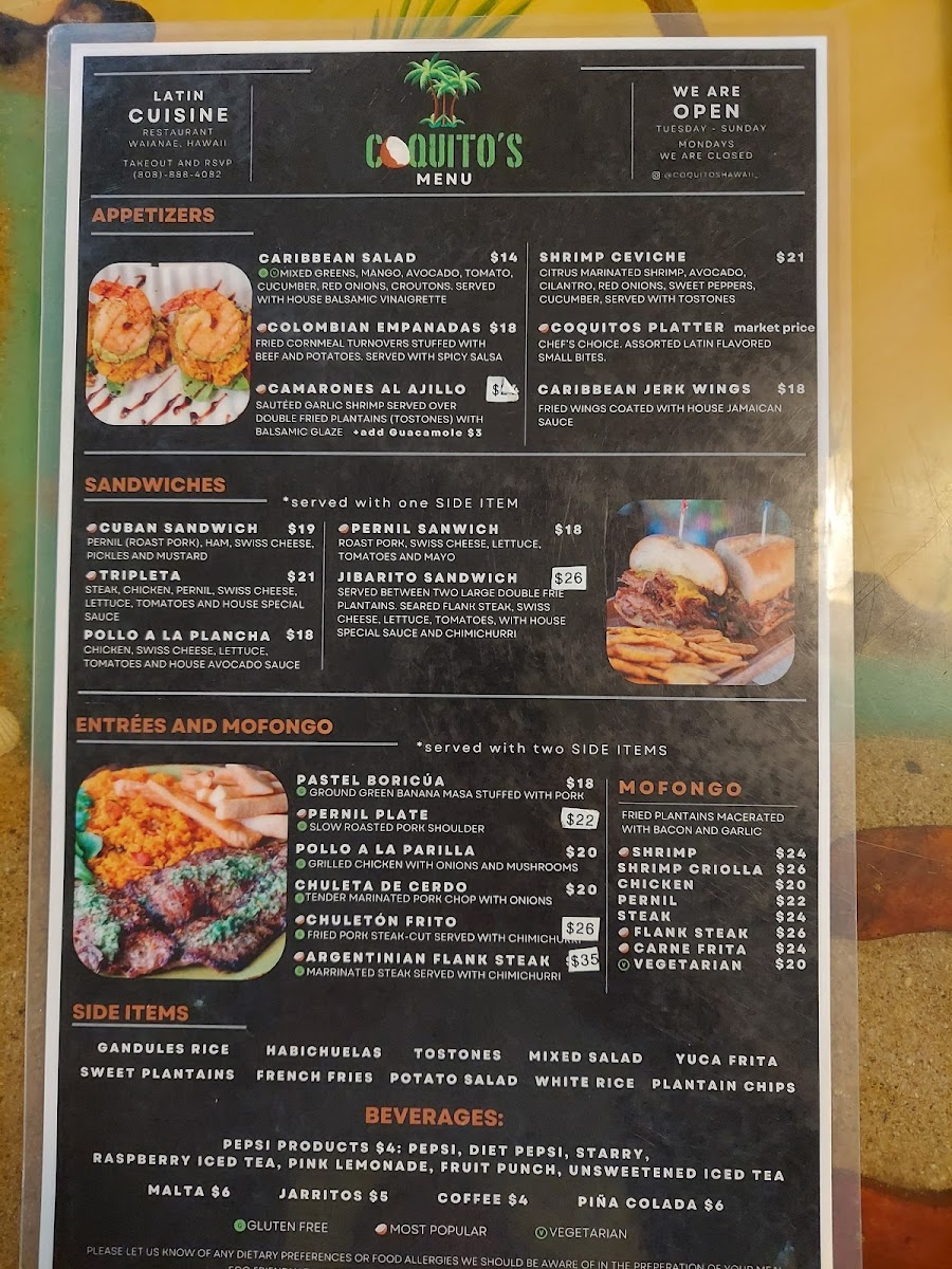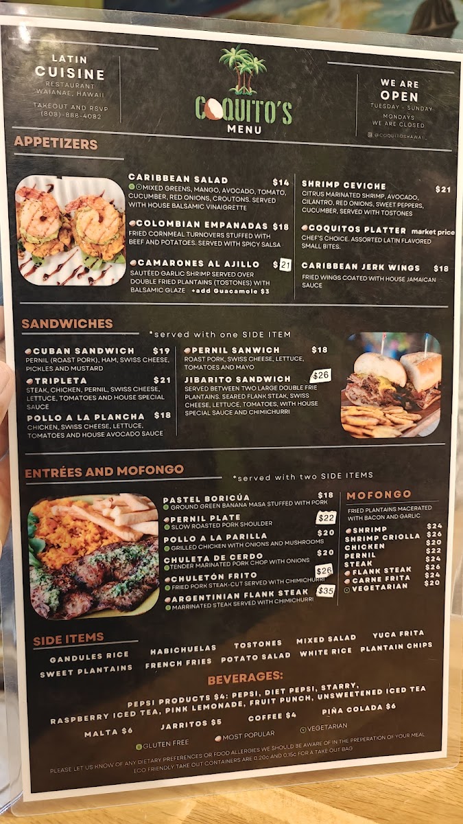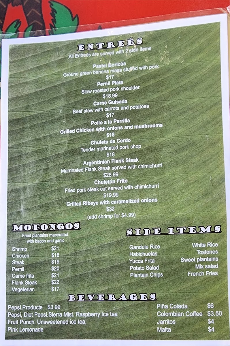 Main entrees are served with a choice of two side items and include traditional preparations of mofongo, a signature dish made from fried plantains mashed with garlic and bacon, topped with proteins like shrimp, chicken, or steak. Other entree options include slow-roasted pork shoulder (pernil) and pasteles boricua.