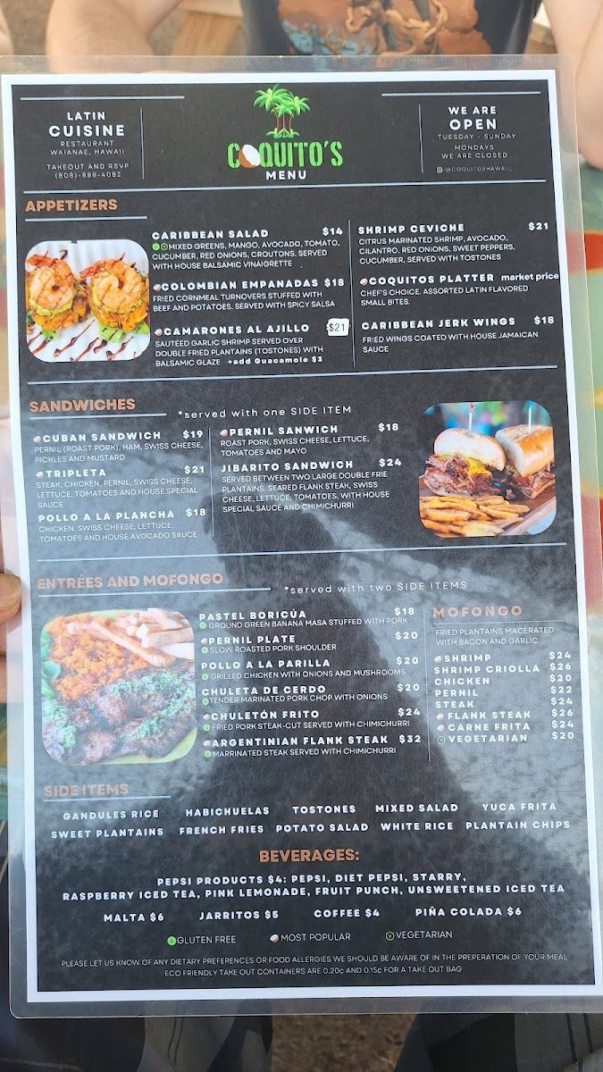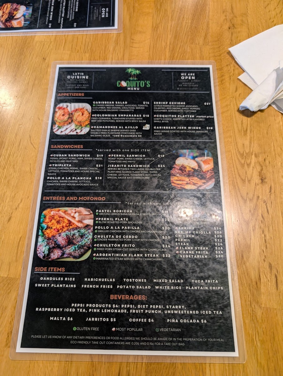 This menu is suitable for casual dining occasions where customers can enjoy lunch or dinner with a range of sandwich options, full entrees, and traditional Puerto Rican desserts. The structured categories allow for straightforward ordering and a diverse selection of flavors and ingredients.