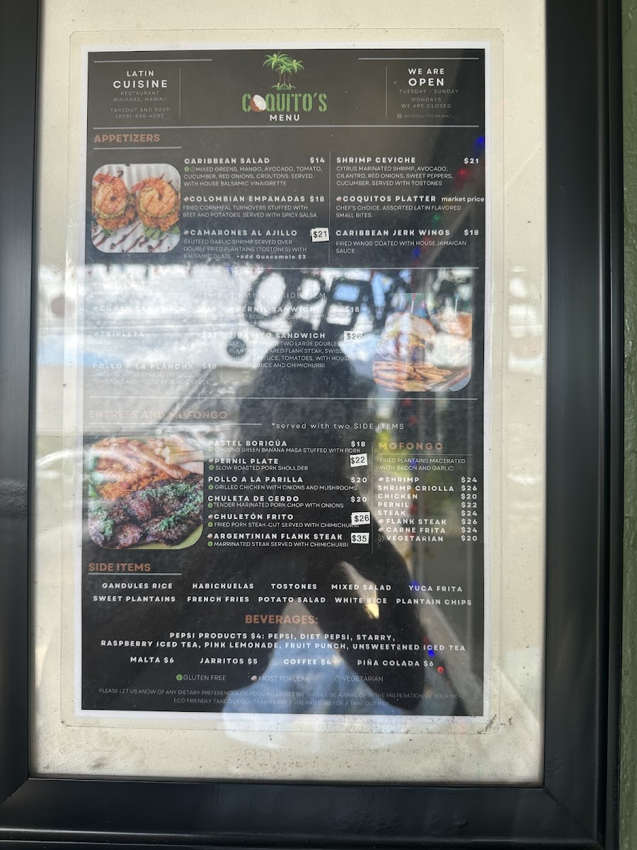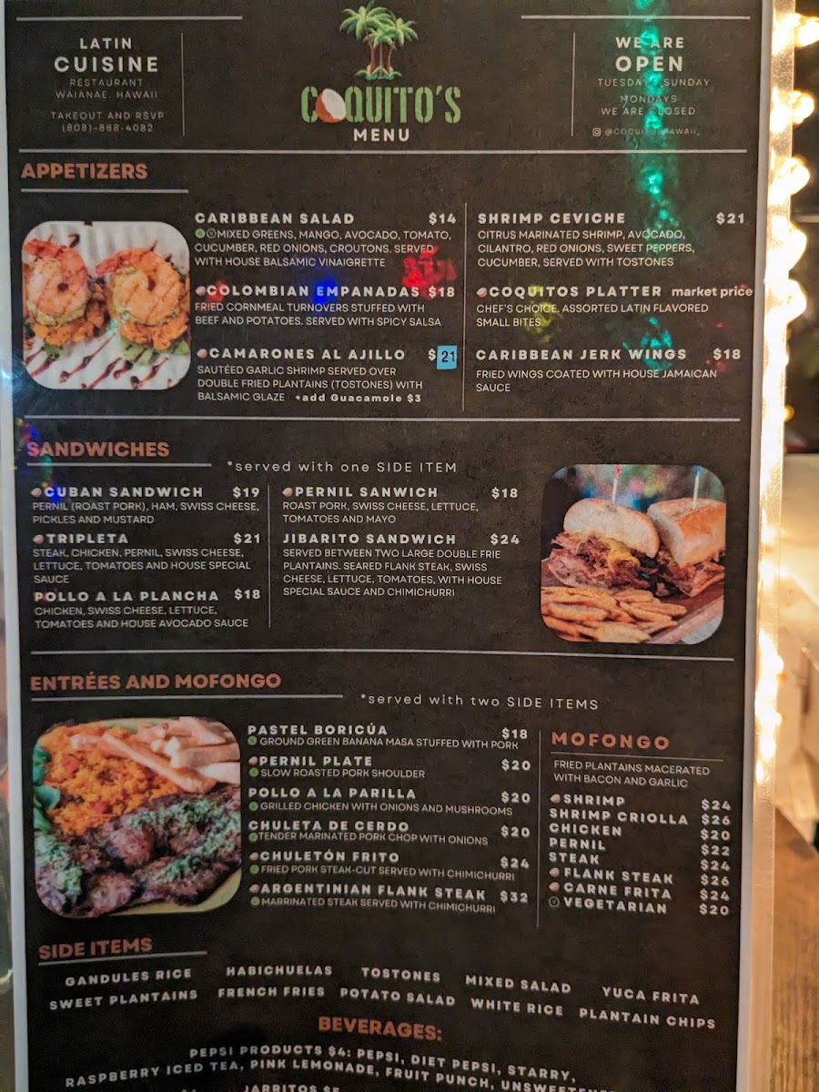 The menu also highlights appetizers and sides such as tostones (double-fried plantains), Colombian empanadas, sweet plantains, camarones al ajillo (shrimp in garlic sauce), and shrimp ceviche. A variety of frozen drinks, including Piña Coladas, complement the food offerings.